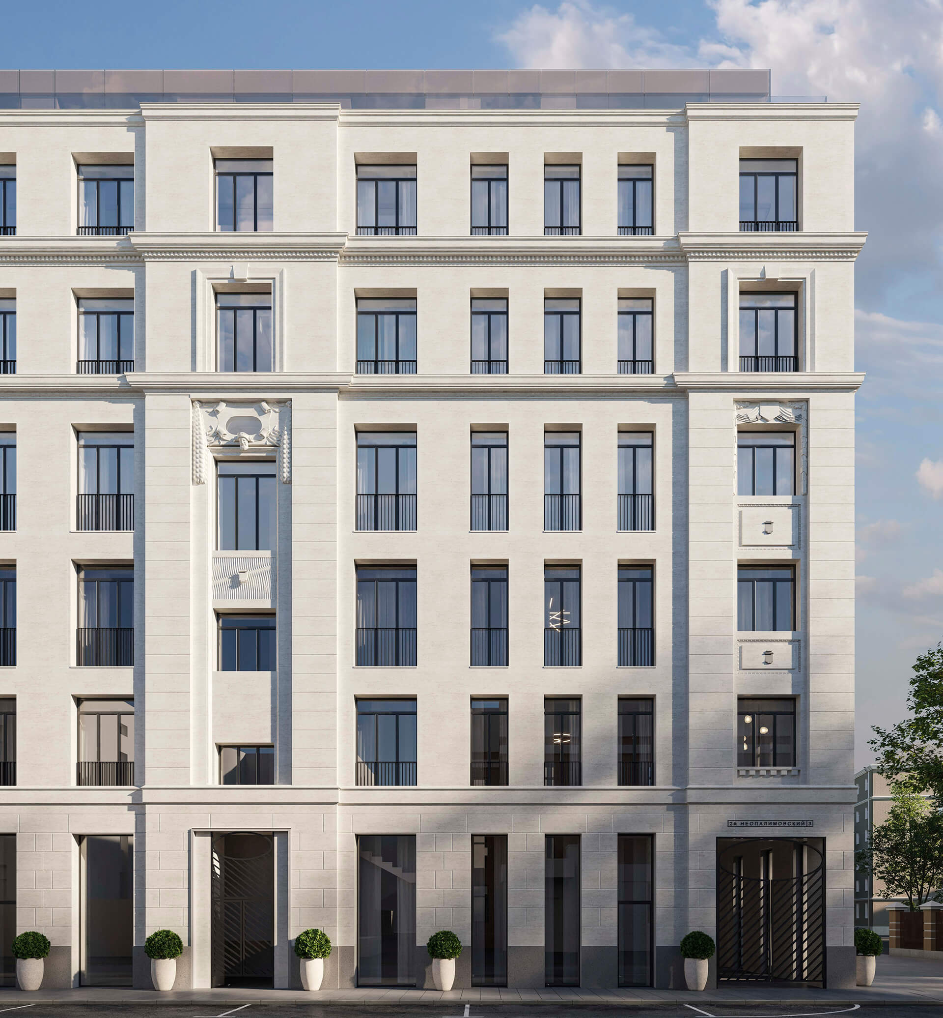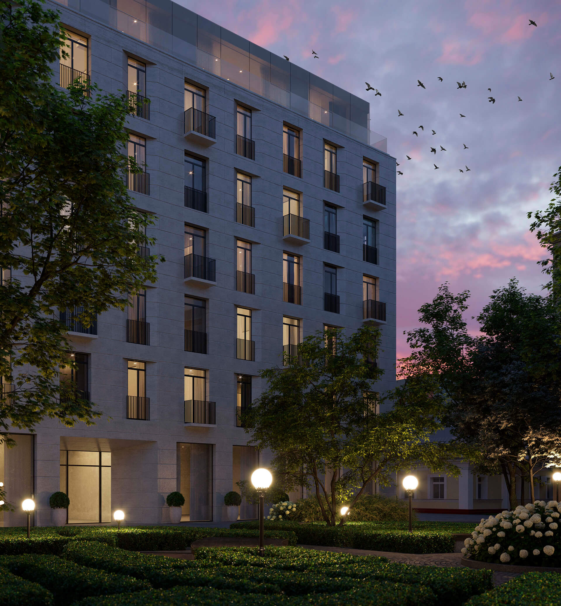 Дизайн здания отличается пропорциональностью, элегантностью и утончённостью: французские балконы, высокие окна и детали фасада добавляют архитектуре аристократичности и открывают виды на внутренний сад. Высокие потолки создают ощущение воздуха и простора, а архитектурные линии поддерживают баланс между декоративностью и минимализмом.