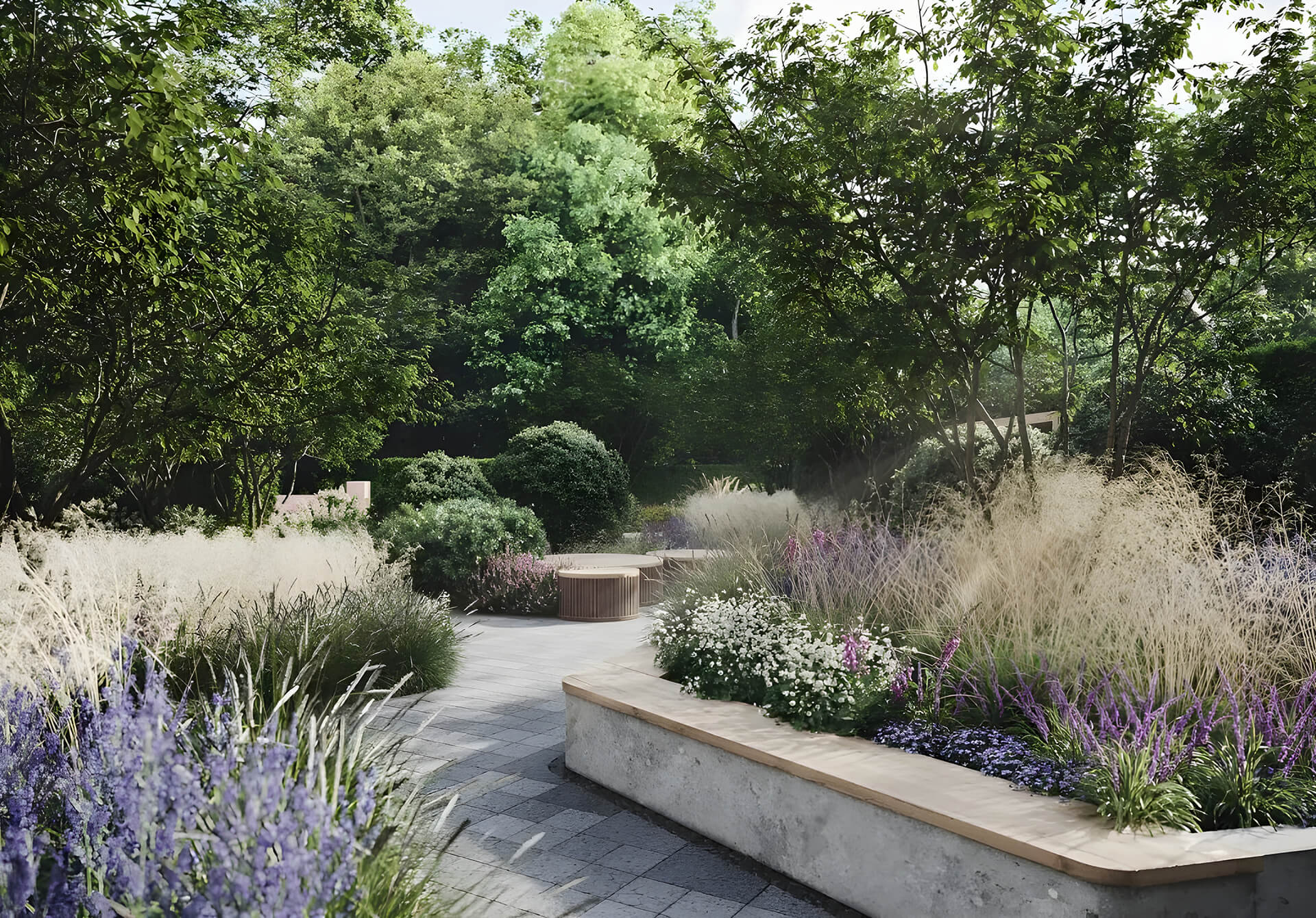 Придомовая территория HIGH GARDEN — это тщательно спланированный приватный сад площадью 1 га, который служит зеленым оазисом в центре мегаполиса. Ландшафтный дизайн вдохновлён романтическими садами: тенистые аллеи, газоны, декоративные растения и цветники создают пространство для прогулок, отдыха и медитации. Такой сад обеспечивает природную атмосферу и спокойствие, несмотря на плотную городскую застройку.