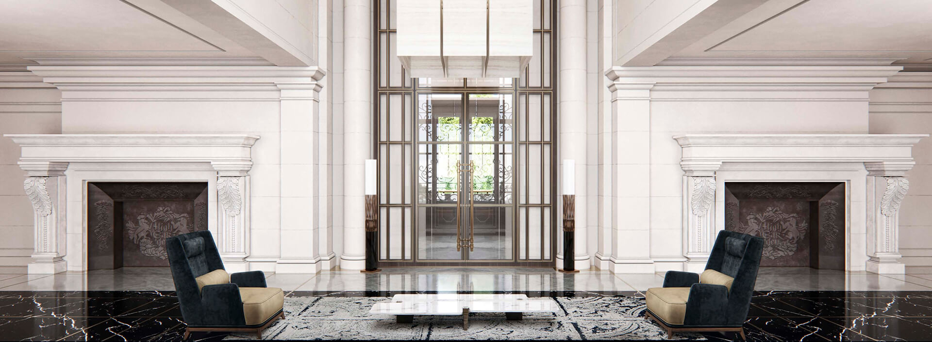 Интерьеры лобби были разработаны дизайнерами, уделившими внимание каждой детали — мягкая мебель, изящные каминные зоны и тщательно продуманные декоративные элементы. Это пространство не только встречает жильцов и гостей, но и становится местом для встреч, отдыха или работы — место, которое задаёт тон всему жилому опыту в HIGH GARDEN.