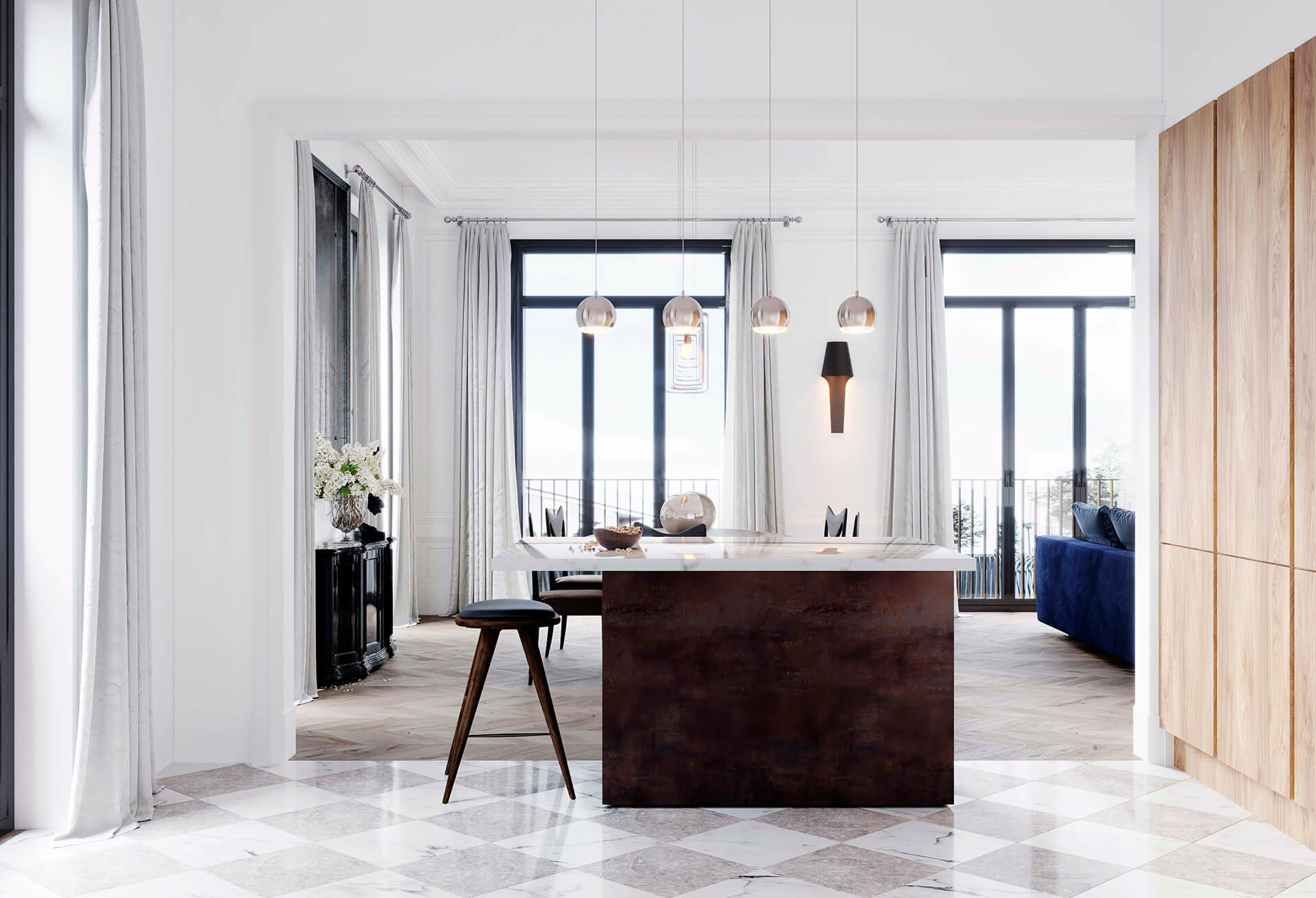 В комплексе всего 39 квартир, каждая из которых обладает авторской отделкой, индивидуальными планировками и панорамными окнами. Высота потолков достигает 3,4–3,6 метров, что создаёт ощущение простора и воздушности. Квартиры спроектированы с чётким зонированием: гостевая зона плавно сочетается с приватной частью, что обеспечивает комфорт и приватность для семей и отдельных резидентов.